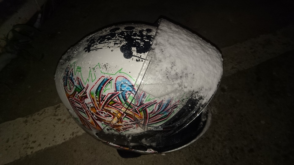 雪の中走るとヘルメットがこうなり前が見えないことがわかりました。