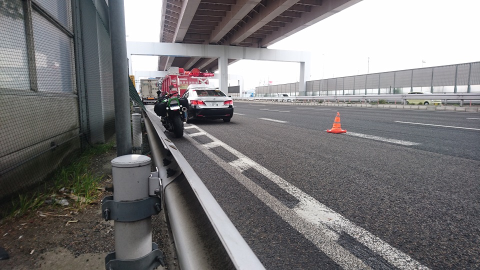 R23のバイパスというのは区間によっては上に伊勢湾岸自動車道が通っており信号の無く片側3車線のため名ばかりの一般道で流れは高速道路並みになることがあります。今回はそれにプラスして前方を走っていたトラックの燃料タンクから軽油が漏れており路面は一部ウエット。いやオイリーな状態かな?上に高架があることと天候が曇りだったことkazzがダークスモークのシールドだったことが重なり路面の状態を把握できていませんでした。