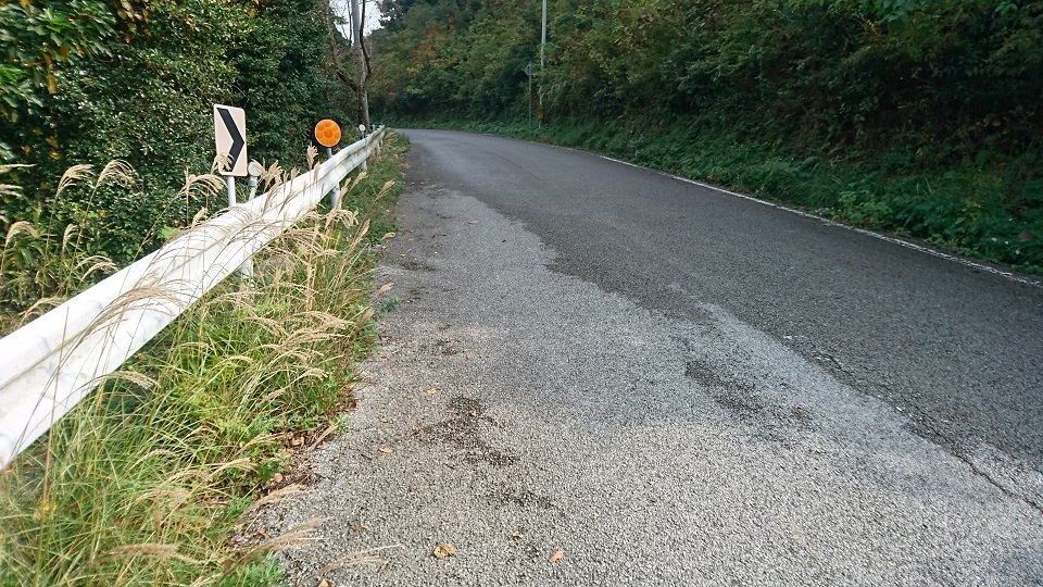 路面はご覧の通りハーフウェットしかも路肩に落ち葉や苔があるところもあり慎重に進みます。
