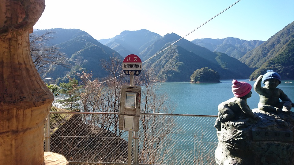 バス停とダム湖です。あとよくわからない像もあります(笑)